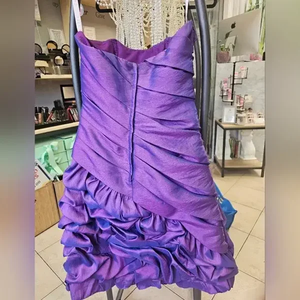 Make a statement with this chic strapless purple dress. Its vibrant color and elegant design are perfect for any special occasion.