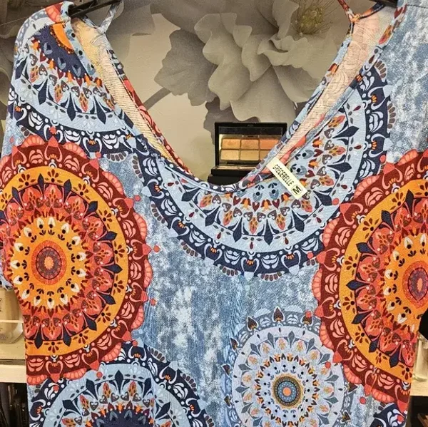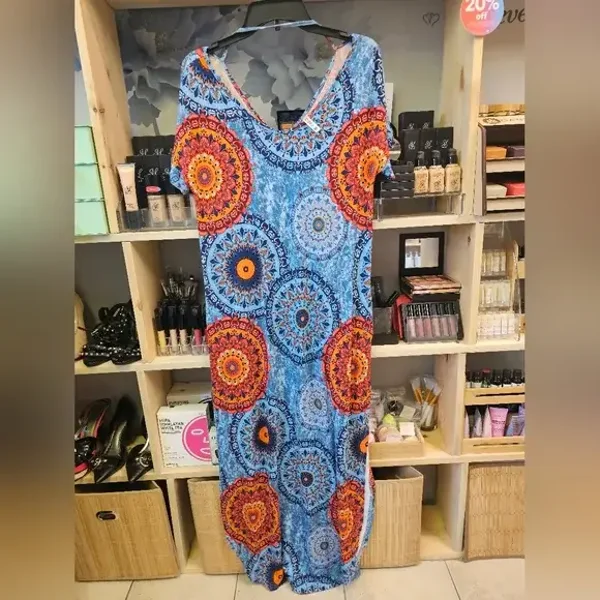 Stunning kaftan dress with a vibrant blue and orange mandala pattern. Perfect for a bohemian look.