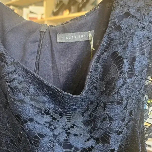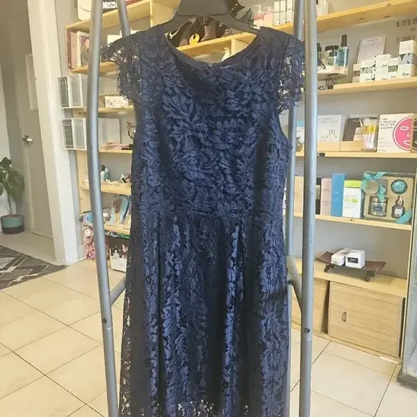 Chic navy lace midi dress. Features delicate lace overlay. Perfect for elegant occasions.